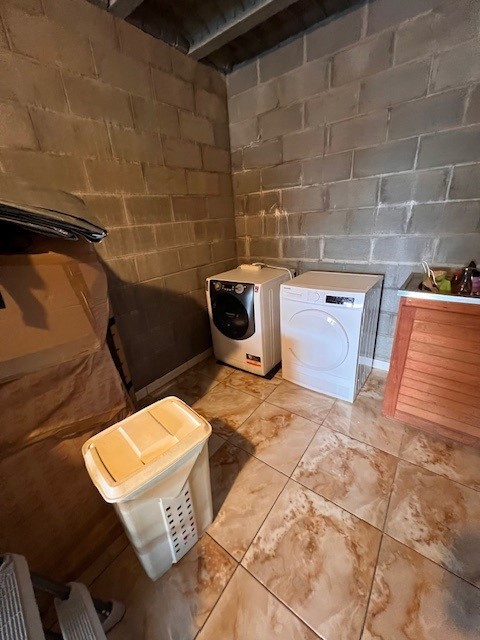 Un grand garage fermé avec branchement machine à laver.